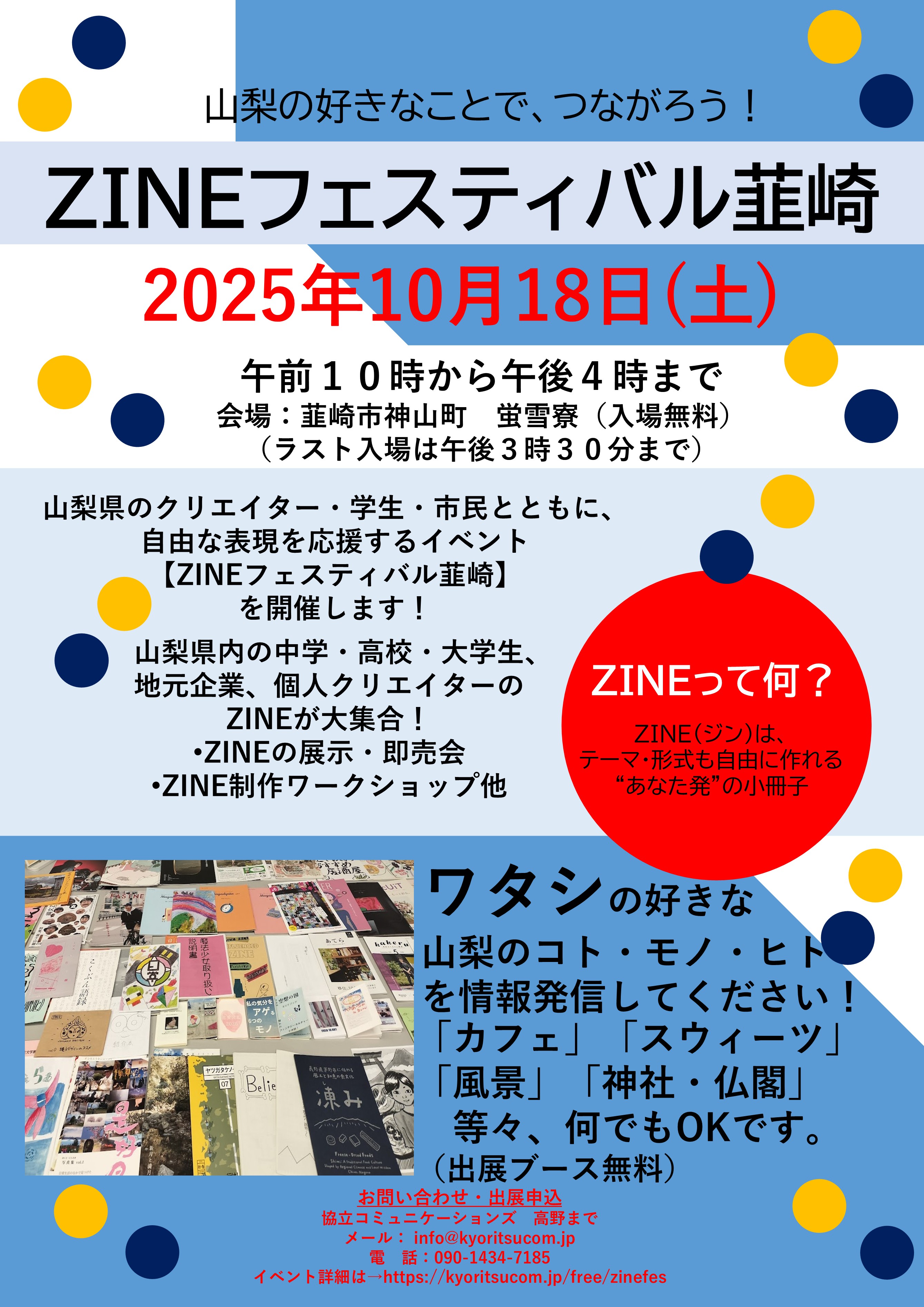 「ZINEフェスティバル韮崎」実行委員会は、山梨県内のクリエイター・学生・市民とともに、自由な表現を応援するイベント【ZINEフェスティバル韮崎】を開催します!